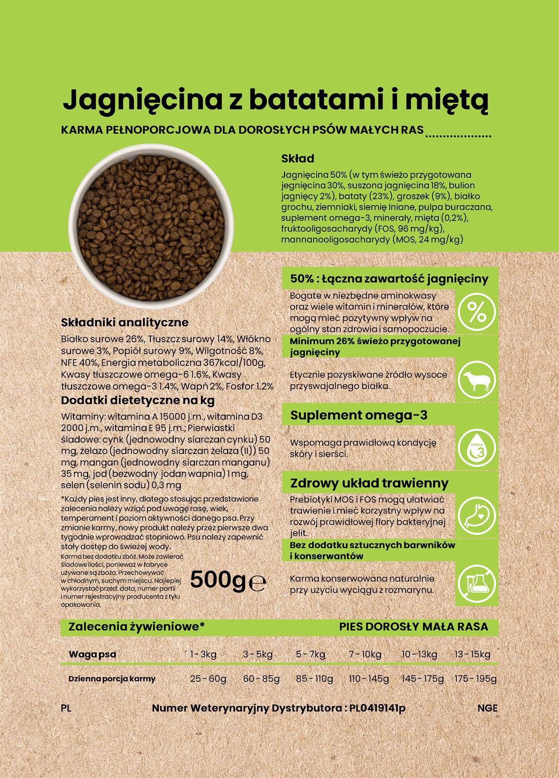 Jagnięcina 50% (w tym świeżo przygotowana jagnięcina 30%, suszona jagnięcina 18%, bulion jagnięcy 2%), bataty (23%), groszek (9%), białko grochu, ziemniaki, siemię lniane, pulpa buraczana, suplement omega-3, minerały, witaminy, bulion warzywny, mięta (0,2%), FOS (96 mg/kg), MOS (24 mg/kg)