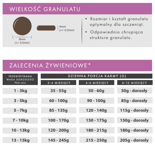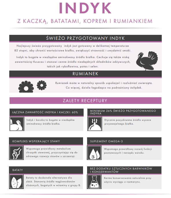 Karma szczególnie polecana jest dla szczeniąt, które nie tylko cenią aromat indyka w połączeniu z kaczką, ale także tych wymagających białka redukującego możliwość wystąpienia reakcji alergicznej. Produkt charakteryzuje się dużą zawartością składników mięsnych, prawidłowo dobranym bilansem białkowo-tłuszczowym, co sprawia, że karma jest pełnowartościowa i powinna być stosowana jako jedyne źródło pożywienia.