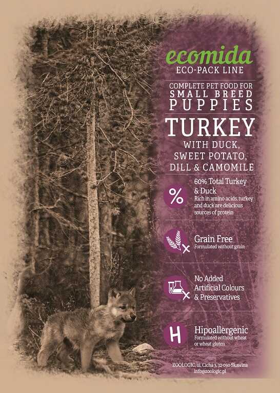 Ecomida z indykiem i kaczką doskonale sprawdzi się u szczeniąt małych ras. Połączenie dwóch źródeł łatwostrawnego białka, sprawia, że karma jest nie tylko wyjątkowo smakowita, chętnie jedzona ale przede wszystkim dobrze przyswajana i odżywcza., dostarczając odpowiedni pozom energii metabolicznej i budulca tkanek w okresie wzrostu.
