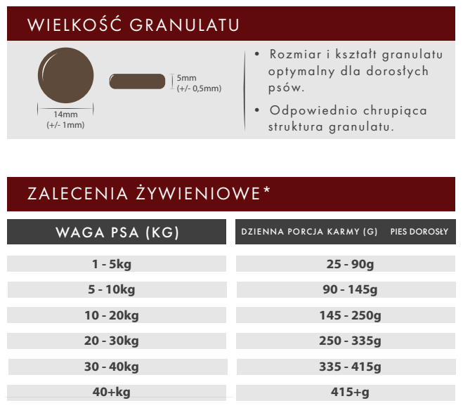 Naszym założeniem w wypadku tej karmy jest dostarczenie najwyższej jakości produktu w jak najbardziej ekonomicznym i ekologicznym opakowaniu. Grafika jest zminimalizowana, a samo opakowanie papierowe, przy wykorzystaniu recyklingu makulatury i przeznaczone po wykorzystaniu do dalszej segregacji. Dzięki temu nie tylko staramy się dbać o środowisko, ale mamy też możliwość zaoferowania naszym klientom bezzbożowego produktu w rozsądnej cenie, który jest porównywalny jakościowo z dużo droższymi markami.Skład: