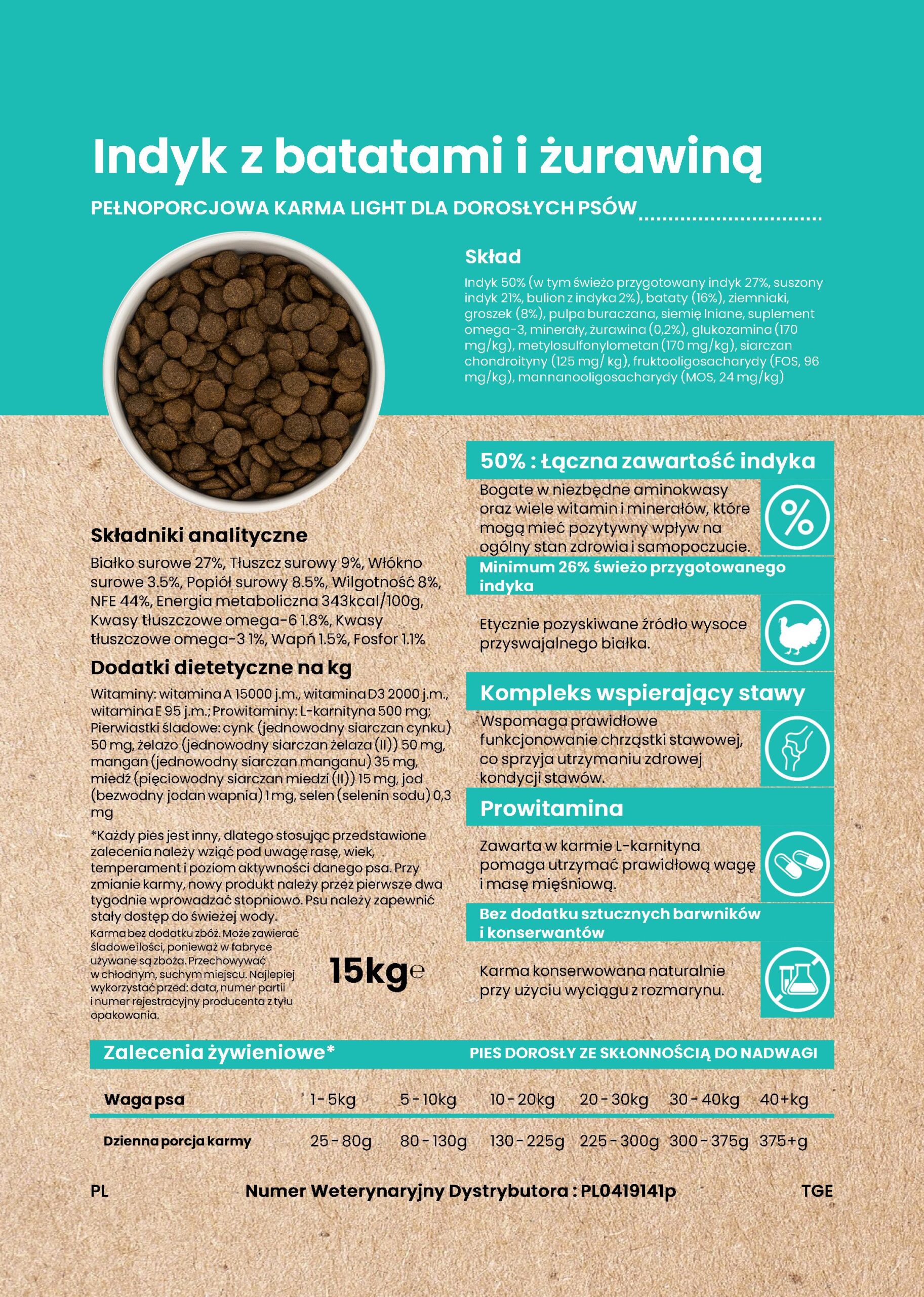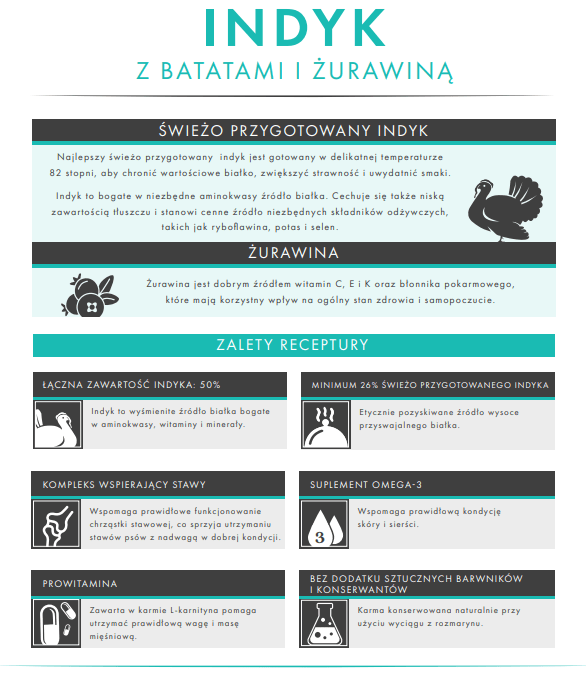 Indyk 50% (w tym świeżo przygotowany indyk 27%, suszony indyk 21%, bulion z indyka 2%), bataty (16%), ziemniaki, groszek (8%), pulpa buraczana, siemię lniane, suplement omega-3, minerały, witaminy, bulion warzywny, żurawina (0,2%), glukozamina (170 mg/ kg), metylosulfonylometan (170 mg/kg), siarczan chondroityny (125 mg/kg), FOS (96 mg/kg), MOS (24 mg/kg)