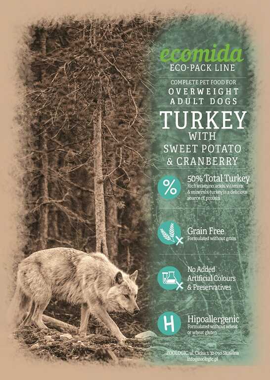 Pełnowartościowa karma ecomida z indykiem dla psów dorosłych, które zmagają się z nadwagą i problemem utrzymania prawidłowej masy ciała.
