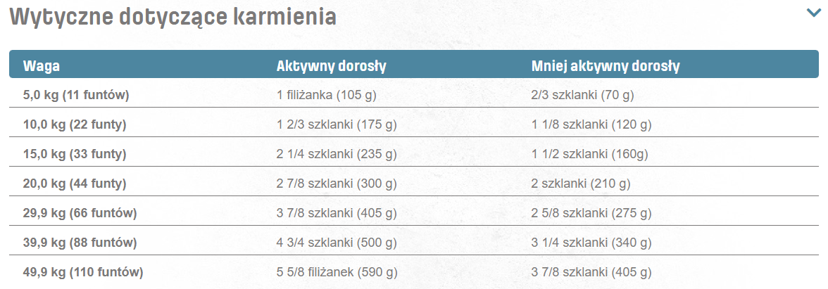 ZAWARTOŚĆ KALORII: (obliczona energia przyswajalna) wynosi 3535 kcal/kg (370 kcal/filiżankę)
