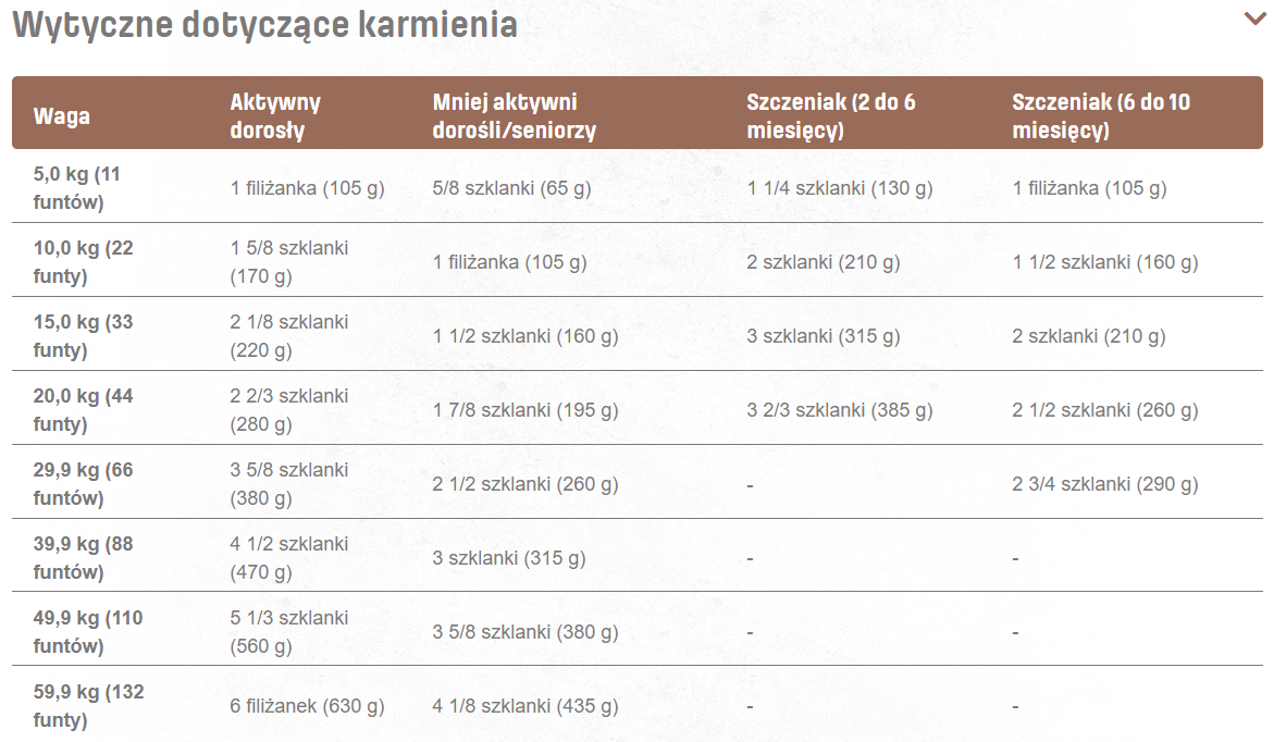 ZAWARTOŚĆ KALORII: (obliczona energia przyswajalna) wynosi 3725 kcal/kg (390 kcal/filiżankę)