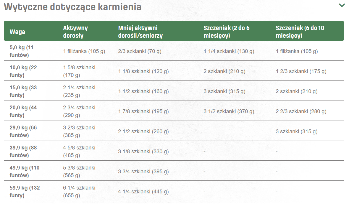 ZAWARTOŚĆ KALORII: (obliczona energia przyswajalna) wynosi 3645 kcal/kg (380 kcal/filiżankę)